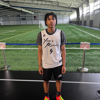 This young man for Young and Reckless 17 is a 6'5" wing who's improved his skill in this sport. Very good at feeding the post, has an improved mid range jump shot. He finished well at the rim end a life of an unsuspecting AJ Bouye defender, and did it with two hands. Had 20 points and 8 rebounds in the win. He defends 1-4 at the high school level very well, moving his feet and showing quiick hands for steals. Also jumps passing lanes and gets steals, finishing with rim rattling dunks. He's a three sport star. He's a 4 star wide receiver with multiple Power 5 offers. He's a track and field athlete who's made the state finals in the jumps (long jump, high jump, triple jump). I was told by a friend who has played in the NFL, he talked to his buddies in the NFL that say barring injury this young man may end up playing on Sunday's barring injury. So which sport is it going to be young man?